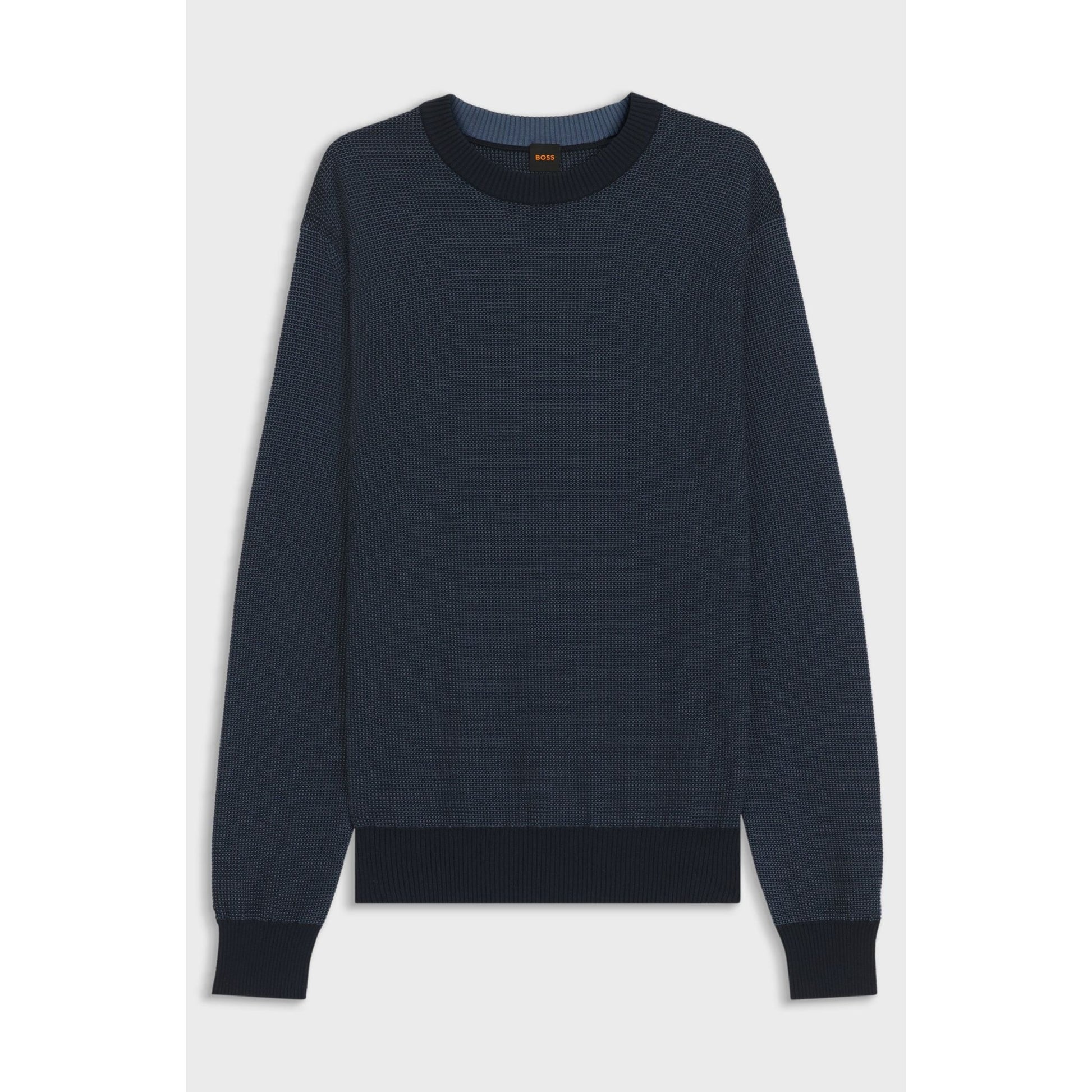 This Hugo Boss Klapok Sweater combines a two-tone knitted design with solid trims for a refined look. Crafted from soft cotton, it ensures comfortable wear throughout the day. The regular fit and classic crew neckline make it a versatile addition to any wardrobe, balancing contemporary style with enduring comfort.