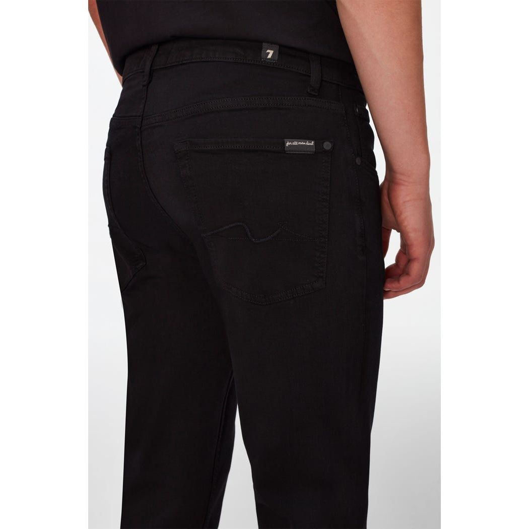 These 7 For All Mankind Slimmy Luxe Performance Black Jeans feature a mid rise, zip fly, and mid waist for a classic look. They are slim fit with a tapered leg and luxe stretch fabric for a comfortable fit and lasting wear.